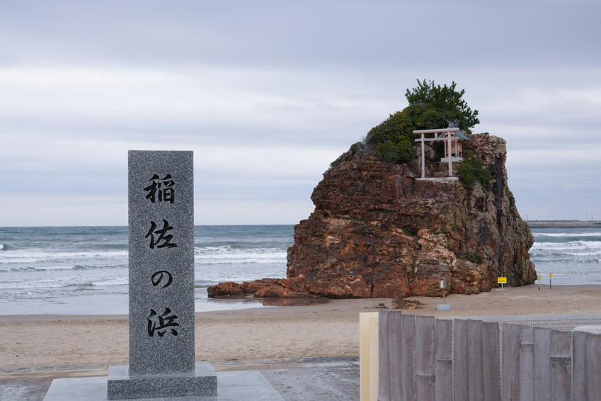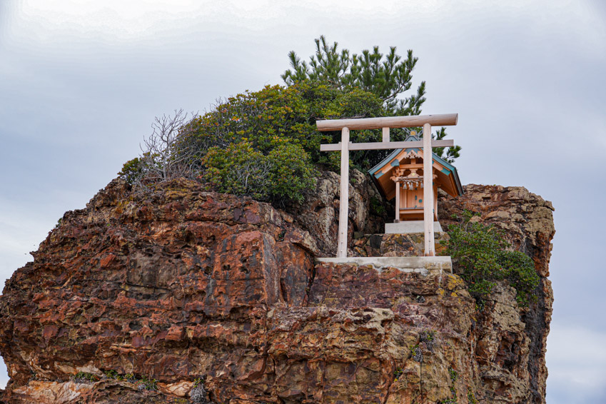 The large rock with a torii gate standing on the white sand looked like something from a myth.